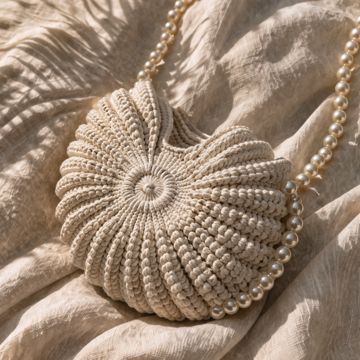 Designed to capture the beauty of the sea, the Nacre Shell Bag blends soft textures, sculptural form, and pearl details into one effortless piece.
